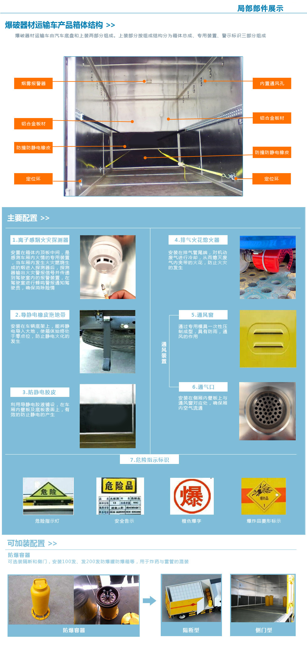 車廂頂部封閉,不可開啟。選裝右側(cè)箱體不開門,。運輸介質(zhì)品名:黑火藥,壓縮黑火藥,電引爆雷管,爆破炸藥,點燃導(dǎo)火索,專用煙火制品。運輸介質(zhì)類項號:1.1D,1.1D,1.1B,1.1D,1.4G,1.1G。防護材料:Q235A碳鋼,連接方式:左右側(cè)面防護采用螺栓連接,后下部防護采用焊接連接,后部防護斷面尺寸(mm):100?0,后部防護離地高度(mm):420。安裝限速裝置,限速80km/h。該車安裝帶有衛(wèi)星定位功能的行駛記錄儀。僅采用前盤制動器和安裝ABS以及前置消聲器的底盤。采用子午線輪胎。ABS廠家:威伯科汽車控制系統(tǒng)(中國)有限公司,ABS型號44600XXXX0。